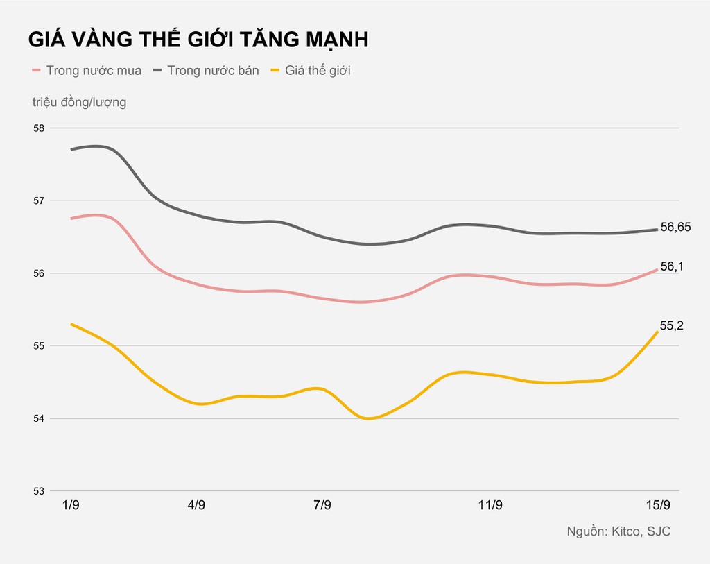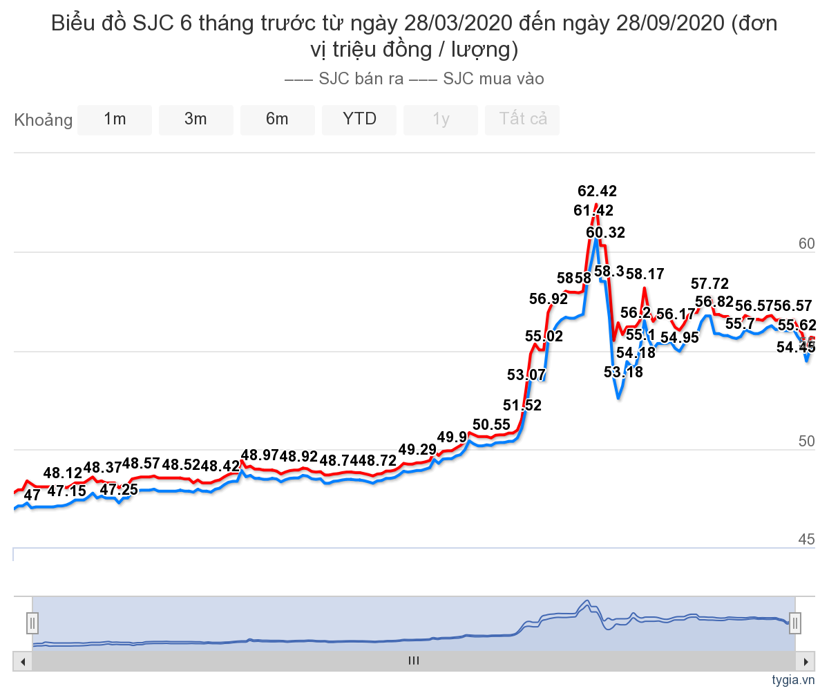 Sau đợt tăng phi mã hồi đầu tháng 8, có thể nói giá vàng đang trong chiều hướng giảm mạnh. Cụ thể, sau khi đạt kỉ lục tới hơn 62 triệu đồng/lượng hôm 8/8, giá vàng SJC hiện chỉ còn khoảng 55,6 triệu đồng/lượng, tức giảm 10,3%.Tương tự, giá vàng thế giới cũng trong xu hướng giảm sau khi đạt đỉnh 2.070 USD/ounce hồi đầu tháng 8. Hiện giá vàng thế giới giao dịch ở mức khoảng 1.852 USD/ounce.