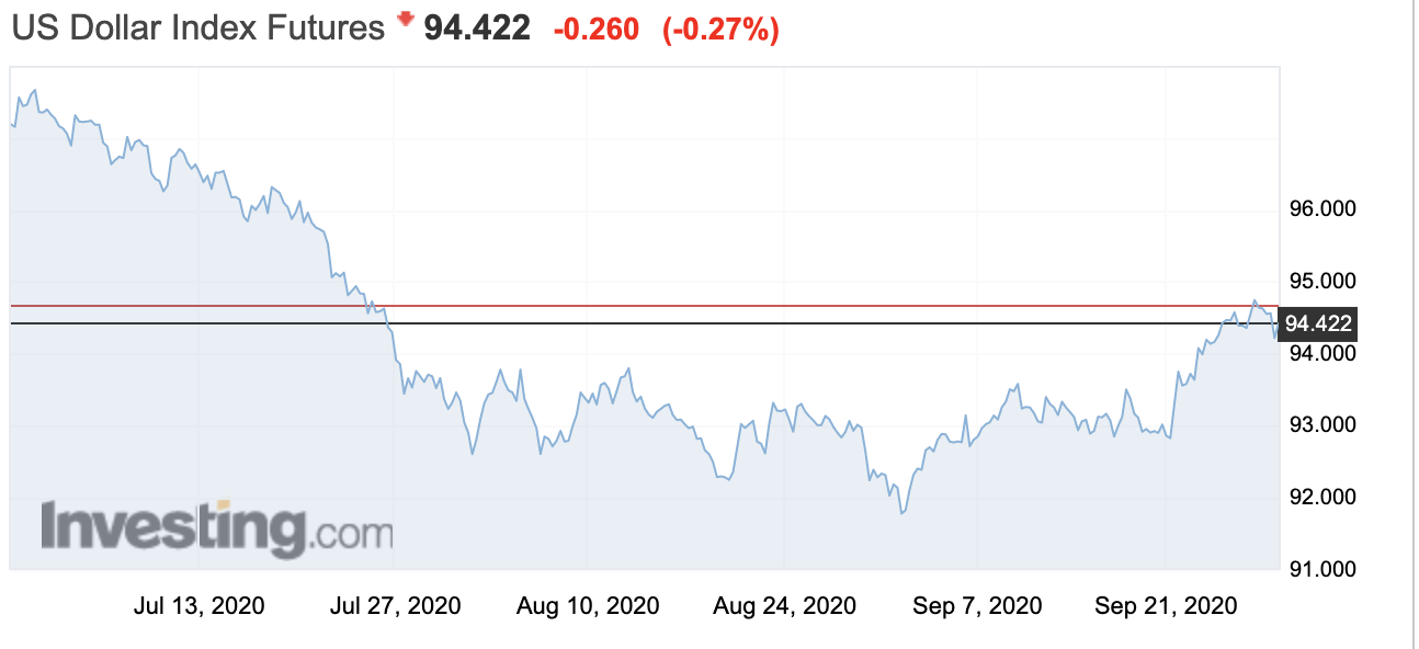 “Giá vàng giảm trong thời gian qua là do nhà đầu tư chốt lời sau đợt giá vàng tăng vừa qua. Bên cạnh đó, nhu cầu đầu tư các tài sản an toàn cũng giảm bớt đi khi ngày càng nhiều tín hiệu tích cực về việc điều chế vắc xin COVID-19.So với ngày 7/8 (thời diểm giá vàng đạt kỉ lục 2.070 USD/ounce), chỉ số đồng USD đã tăng 1,5 điểm lên 94,5 điểm, theo dữ liệu từ Investing.com.